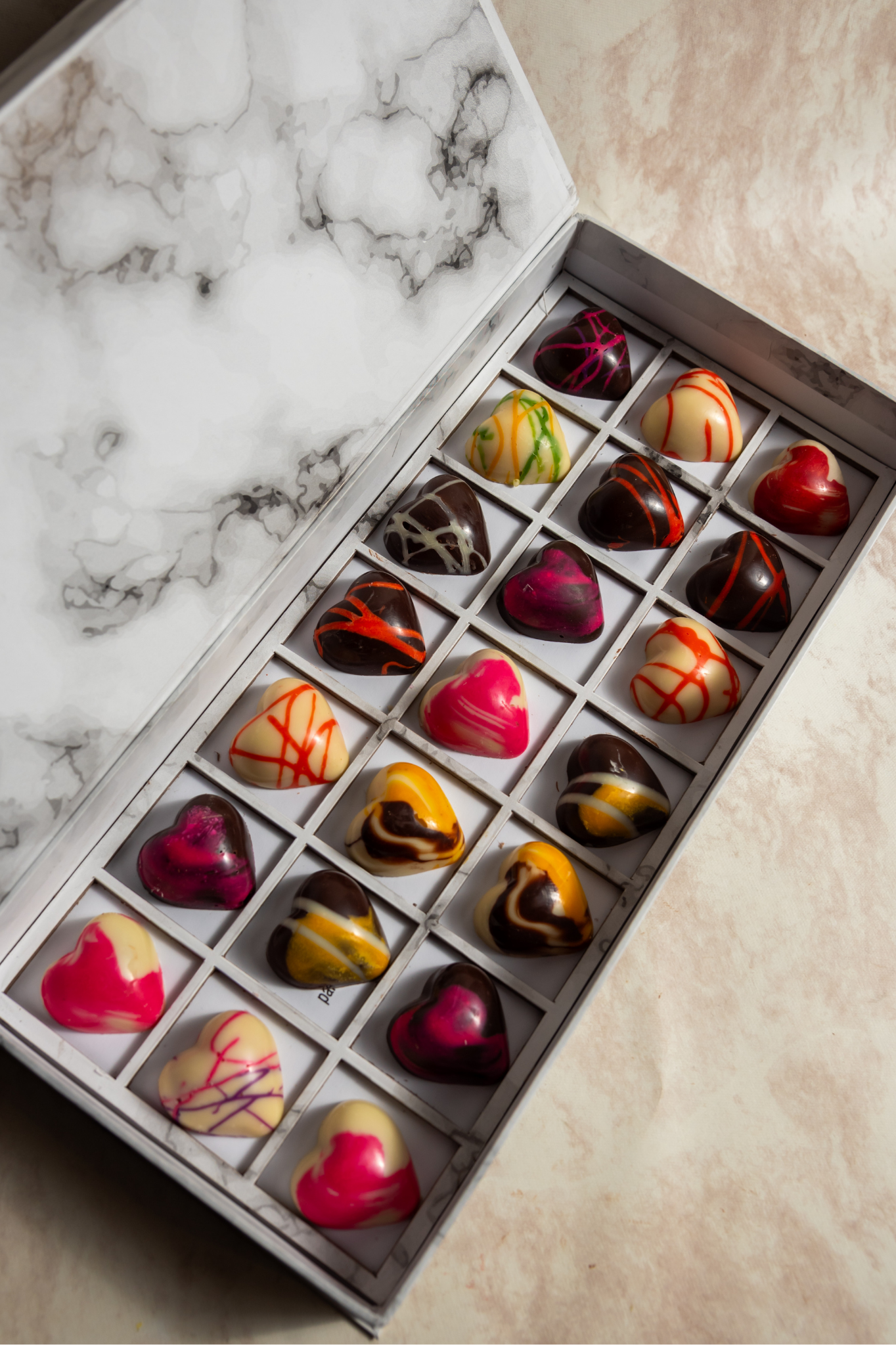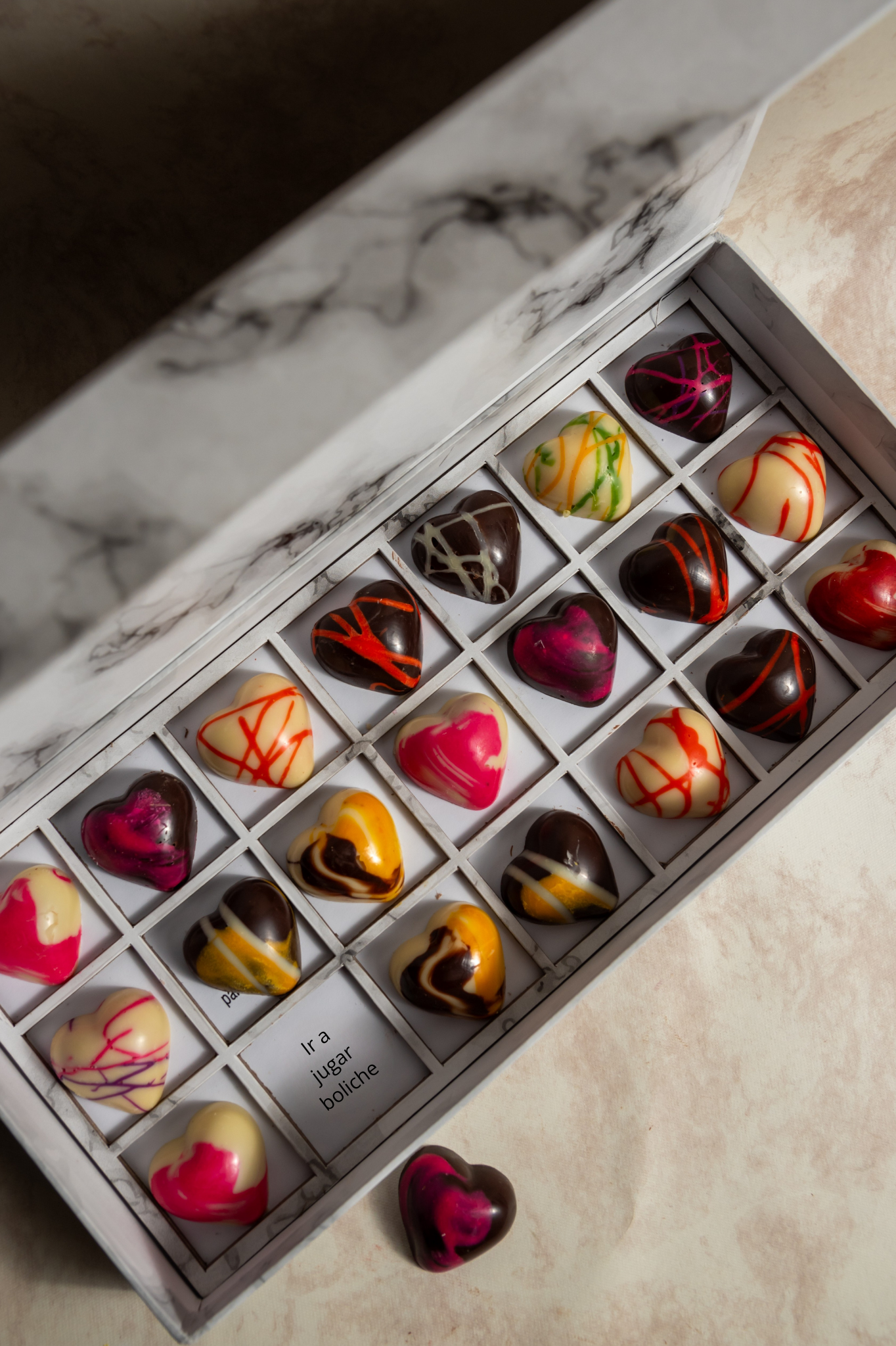 Cada caja incluye 21 chocolates con una cita escondida debajo: romántica, divertida o profunda.